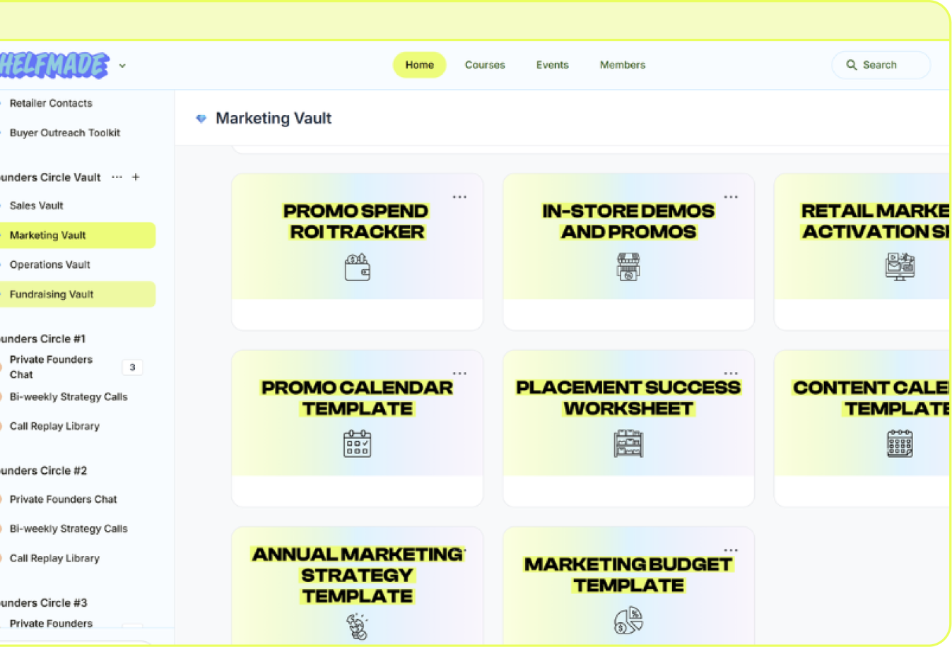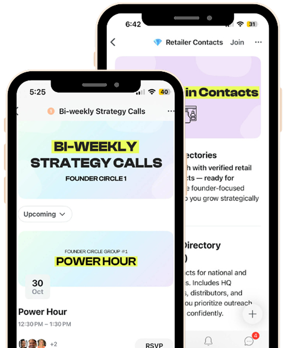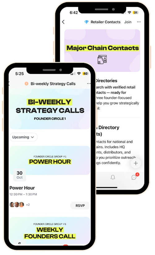 You’ll work directly with Ashley, industry experts, and founders inside small advisory pods that meet live each week. Get real-time feedback, strategy sessions, and access to the ShelfMade Resource Vault, complete with buyer contacts, templates, and systems from 15+ years in CPG.